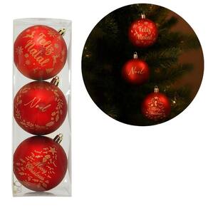 Kit com 3 Bolas de Natal Vermelhas Foscas com Mensagens Douradas – 8cm | "Merry Christmas", "Noel" e "Feliz Natal"