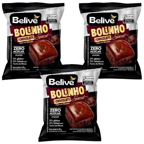 Kit 3 Bolinho Sabor Chocolate Especial 45g - Belive O sabor intenso do chocolate em cada mordida A Belive apresenta um bolinho macio e saboroso, feito para encantar os amantes de chocolate. Uma versão prática e individual que leva o sabor marcante do cacau para qualquer momento do dia. Descrição principal Com 45g em uma embalagem prática, este bolinho traz uma massa fofa e delicada, realçada pelo sabor intenso do chocolate. Sua textura macia e o aroma irresistível transformam cada mordida em uma experiência especial, lembrando o tradicional bolo caseiro de chocolate. Ideal para acompanhar cafés, chás, sucos ou para saborear sozinho em qualquer pausa do dia. Sugestões de uso - Perfeito para o lanche da manhã ou da tarde - Para acompanhar café, chá ou sucos - Como uma sobremesa prática e individual Destaques do produto - Sabor marcante de chocolate - Textura fofa e macia - Praticidade em porção individual de 45g - Embalagem moderna e funcional - Produzido pela Belive, referência em produtos saborosos e criativos Ingredientes Farinha de arroz, açúcar, ovos, óleo vegetal, cacau em pó, fécula de batata, fermentos químicos bicarbonato de sódio, fosfato monocálcico e pirofosfato ácido de sódio , emulsificantes, estabilizantes e aroma idêntico ao natural de chocolate. Informações para alérgicos Contém ovos. Pode conter traços de leite, soja e castanhas. Modo de armazenar Conservar em local fresco, seco e protegido da luz. Após aberto, consumir imediatamente para melhor aproveitamento do produto. Marca: Não Informado