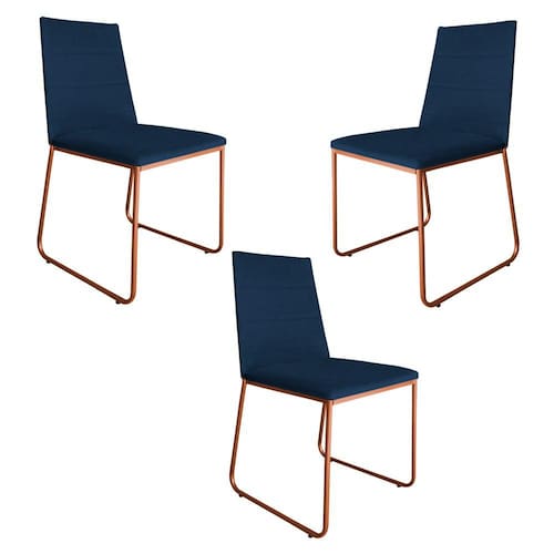 Kit 3 Cadeiras de Jantar Estofada Lille Base Bronze Veludo Azul Marinho chegou essa incrível novidade para você, que deseja inovar e decorar o seu espaço com muito Estilo. A Cadeira Lille possui uma matéria-prima de ótima qualidade, garantindo conforto e durabilidade do produto. Possui variações de cores tanto na base e no assento, oferecendo várias opções de escolha para sua decoração.