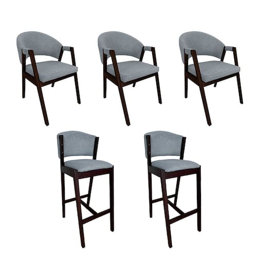 Kit 3 Cadeiras de Jantar Helen com 2 Banquetas Ana Madeira Maciça Castanho Premium Linho Cinza