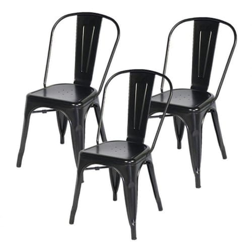 Kit 3 Cadeiras Tolix Iron Metal Aço Industrial Preta !! Pret Kit 3 Cadeiras Tolix Iron Metal Aço Industrial Preta !! Pret Cadeira Tolix Iron Design Cadeira Fixa Design Tolix Metal Pelegrin PEL-1518 Preta Conhecida popularmente como ?Cadeira Francesinha?, tem grande influência no mercado europeu devido ao seu elegante design retrô. O modelo clássico idealizado pelo francês Xavier Pauchard nos anos 20 foi resultado de seu experimento pioneiro da fabricação de móveis com metal galvanizado.A cadeira com formas simples, porém funcionais fez tanto sucesso que se tornou muito popular em fábricas, escritórios, restaurantes, bem como nos cafés, bares e parques públicos da época. Hoje conhecida como ?Cadeira Tolix?, é um ícone da estética industrial, podendo ser utilizada em qualquer ambiente trazendo elegância e personalidade.Com estrutura em aço de carbono e acabamento em pintura eletrostática, pode ser utilizada em ambientes externos. Projetada com alguns furos em seu assento com a finalidade de não acumular água, facilitando sua limpeza e manutenção.A ?Cadeira Tolix? é clássica, com design vintage e pode ser combinada com outros modelos de cadeiras. Disponível em variedade de cores, permitindo um ambiente mais descontraído. Instruções De LimpezaAplique um sabão em uma esponja úmida e limpe toda a superfície da banqueta, e logo em seguida, limpe o sabão com um pano branco úmido. Assento: Aço com Pintura EpóxiBase: Aço com Pintura Epóxi Profundidade: 47 cmLargura: 45 cmAltura Total: 86 cmAltura do Chão Até o Assento: 45 cmProfundidade Interna do Assento: 36 cmLargura Interna do Assento: 45 cmPeso Máx. Recomendado: 120 kgsPeso unitário: 6 kgs
