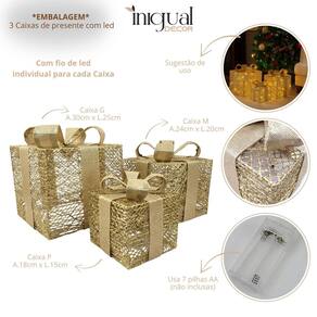Kit 3 Caixa De Presente Aramada Dourada Decoração Natal Trio de Caixas Decorativas Aramadas Douradas com Laço P, M e G Inigual Decor Adicione um toque de elegância e sofisticação à sua decoração de Natal com o Trio de Caixas de Presente Decorativas da Inigual Decor. Este conjunto é perfeito para criar uma decoração encantadora embelezar qualquer canto da sua casa com o espírito natalino. Confeccionadas em estrutura aramada dourada, as caixas combinam a leveza e a transparência do metal com um brilho festivo. O design de cada caixa é complementado por um laço em tecido estruturado. Com três tamanhos distintos P, M e G , o trio se adapta a diferentes necessidades, seja para criar uma torre de presentes decorativa ou para compor diversos pontos de luz e charme em seu ambiente. É a escolha ideal para quem busca uma decoração versátil e impactante, que une a beleza do design com a tradição das festas de fim de ano. Por Que Escolher o Trio de Caixas Aramadas Inigual Decor Design Único: A estrutura aramada dourada oferece um visual moderno e elegante, permitindo que a luz passe por entre a trama. Detalhes Festivos: O brilho adiciona um toque sofisticação do Natal. Conjunto Versátil: A variedade de tamanhos P, M e G permite criar diferentes composições decorativas. Material Durável: Feito para durar, este trio pode ser e apreciado por muitos Natais. Beleza e Funcionalidade: Ideal para decorar, presentear e decorar o pé da árvore. Especificações do Produto: Material: Metal, Tecido Cor: Dourada Conteúdo da Embalagem: 3 Caixas de Presente Decorativas 1 Pequena, 1 Média, 1 Grande Dimensões e Pesos Individuais: Caixa P: Altura Aprox.: 18,0 cm Largura Aprox.: 15,0 cm Profundidade Aprox.: 15,0 cm Peso Aprox.: 140 g Caixa M: Altura Aprox.: 24,0 cm Largura Aprox.: 20,0 cm Profundidade Aprox.: 20,0 cm Peso Aprox.: 235 g Caixa G: Altura Aprox.: 30,0 cm Largura Aprox.: 25,0 cm Profundidade Aprox.: 25,0 cm Peso Aprox.: 355 g Importante: As imagens ambientadas são ilustrativas. Itens decorativos adicionais exibidos nas fotos não acompanham o produto. Marca: Não Informado