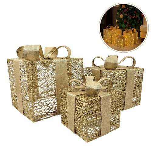 Kit 3 Caixa De Presente Aramada Dourada Decoração Natal Trio de Caixas Decorativas Aramadas Douradas com Laço P, M e G Inigual Decor Adicione um toque de elegância e sofisticação à sua decoração de Natal com o Trio de Caixas de Presente Decorativas da Inigual Decor. Este conjunto é perfeito para criar uma decoração encantadora embelezar qualquer canto da sua casa com o espírito natalino. Confeccionadas em estrutura aramada dourada, as caixas combinam a leveza e a transparência do metal com um brilho festivo. O design de cada caixa é complementado por um laço em tecido estruturado. Com três tamanhos distintos P, M e G , o trio se adapta a diferentes necessidades, seja para criar uma torre de presentes decorativa ou para compor diversos pontos de luz e charme em seu ambiente. É a escolha ideal para quem busca uma decoração versátil e impactante, que une a beleza do design com a tradição das festas de fim de ano. Por Que Escolher o Trio de Caixas Aramadas Inigual Decor Design Único: A estrutura aramada dourada oferece um visual moderno e elegante, permitindo que a luz passe por entre a trama. Detalhes Festivos: O brilho adiciona um toque sofisticação do Natal. Conjunto Versátil: A variedade de tamanhos P, M e G permite criar diferentes composições decorativas. Material Durável: Feito para durar, este trio pode ser e apreciado por muitos Natais. Beleza e Funcionalidade: Ideal para decorar, presentear e decorar o pé da árvore. Especificações do Produto: Material: Metal, Tecido Cor: Dourada Conteúdo da Embalagem: 3 Caixas de Presente Decorativas 1 Pequena, 1 Média, 1 Grande Dimensões e Pesos Individuais: Caixa P: Altura Aprox.: 18,0 cm Largura Aprox.: 15,0 cm Profundidade Aprox.: 15,0 cm Peso Aprox.: 140 g Caixa M: Altura Aprox.: 24,0 cm Largura Aprox.: 20,0 cm Profundidade Aprox.: 20,0 cm Peso Aprox.: 235 g Caixa G: Altura Aprox.: 30,0 cm Largura Aprox.: 25,0 cm Profundidade Aprox.: 25,0 cm Peso Aprox.: 355 g Importante: As imagens ambientadas são ilustrativas. Itens decorativos adicionais exibidos nas fotos não acompanham o produto. Marca: Não Informado