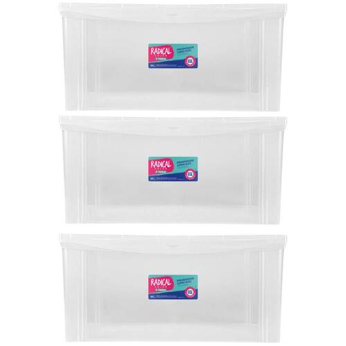 O kit de 3 caixas plásticas organizadoras 65L transparentes com tampa e trava Radical Color é perfeito para diversas necessidades de armazenamento. Cada caixa, com capacidade de 65 litros, é feita de plástico transparente que facilita a visualização do conteúdo. A tampa com trava proporciona segurança e proteção contra poeira e umidade. Versáteis e multiuso, são ideais para organizar roupas, brinquedos, documentos e outros itens em casa, escritórios ou outros ambientes. Empilháveis, ajudam a otimizar o espaço disponível.