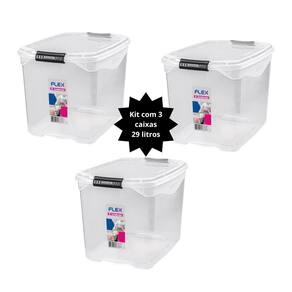 Kit 3 Caixas Organizadora Multiuso 29 litros FLEX Sanremo Kit 3 Caixas Organizadoras Multiuso 29 litros Sanremo A Caixa Organizadora Multiuso 29 litros Sanremo é a solução perfeita para quem busca praticidade e eficiência na organização dos espaços. Com um design moderno e funcional, esta caixa organizadora é ideal para armazenar uma variedade de itens, mantendo tudo em ordem e facilmente acessível. Características Principais: Capacidade Generosa: Com uma capacidade de 29 litros, a caixa oferece amplo espaço para armazenar diversos tipos de objetos, desde mantimentos e material de limpeza e higiene, a brinquedos e até ferramentas e materiais de escritório. Material Durável: Fabricada em polipropileno de alta qualidade, a caixa é resistente e durável, suportando o uso diário e protegendo os itens armazenados. Transparência Prática: A caixa possui um corpo transparente, permitindo visualizar o conteúdo sem a necessidade de abrir a tampa, facilitando a identificação rápida dos itens. Tampa Segura: A tampa possui um encaixe perfeito e firme, garantindo que os itens fiquem protegidos contra poeira e umidade. As travas laterais adicionais proporcionam segurança extra. Design Empilhável: Projetada para ser empilhável, a caixa permite otimizar o espaço de armazenamento, mantendo tudo organizado e economizando espaço. Alças Integradas: As alças laterais facilitam o transporte, mesmo quando a caixa está cheia, garantindo praticidade no manuseio. Benefícios Adicionais: Versatilidade de Uso: Ideal para uso em casa, no escritório, em garagens ou áreas de serviço, a caixa organizadora é versátil e atende a diversas necessidades de organização. Fácil de Limpar: O material de polipropileno é fácil de limpar, permitindo que a caixa mantenha sua aparência nova e higiênica por mais tempo. Estilo Moderno: Com um design clean e moderno, a caixa se integra bem em qualquer ambiente, seja ele residencial ou comercial. Ideal Para: Organização Residencial: Perfeita para organizar brinquedos, utensílios domésticos e muito mais. Uso em Escritórios: Ideal para armazenar materiais de escritório, documentos e outros suprimentos, mantendo o ambiente de trabalho ordenado. Armazenamento em Garagens e Oficinas: Excelente para guardar ferramentas, equipamentos e peças, facilitando o acesso e a organização. Especificações Técnicas: Dimensões aproximada da unidade: 42cm de largura x 26cm de altura x 30cm de profundidade Peso aproximado unidade: 800g Capacidade: 29 litros Material: polipropileno de alta qualidade Cor: transparente Período de : 30 dias A Caixa Organizadora Multiuso 29 litros Sanremo é a escolha ideal para quem busca organizar o espaço de forma prática e eficiente. Com sua capacidade generosa, durabilidade e design funcional, ela facilita a vida cotidiana, mantendo tudo em ordem e ao seu alcance. Invista na organização e na qualidade e transforme o seu espaço em um ambiente mais prático e organizado. Conteúdo da Embalagem: 3 Caixas Organizadoras Multiuso 29 litros A caixa pode ser Utilizado em ambientes externos A caixa é ideal para uso em ambientes internos. Se for utilizada em ambientes externos, recomenda-se protegê-la de exposição direta ao sol e à chuva para prolongar sua durabilidade. A caixa é empilhável sim, a caixa foi projetada para ser empilhável, permitindo otimizar o espaço de armazenamento e mantendo tudo organizado. Linha FLEX