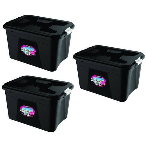 Kit 3 Caixas Organizadoras Preta 56 Litros com Travas PP Uninjet Kit 3 Caixas Organizadoras Em Polipropileno 56 Litros Uninjet Disponível -preta com Trava58cm C x 40Cm L x 34cm A Caixas super resistentes. Espaçosas, material de qualidade. Versátil. Podem ser usadas para vários tipos de necessidades.