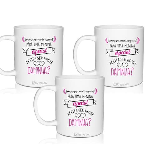 As Canecas Convite são uma forma linda e deliciosa de convidar ou agradecer os pequenos por participarem de uma data tão única Com capacidade de 300 ml, você tem a opção de encher as canecas com todo tipo de doce e assim encantar as futuras Daminhas. O sim delas será GARANTIDO Conteúdo: 3 Canecas Convite Branca Personalizado Daminha Capacidade: 300 ml Cor: Branco Material: Policarbonato Quantidade: 3 Peças Ean: 7897581923476