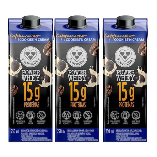 Kit 3 Bebida Láctea Power Whey Cappuccino Cookiesn Cream 250ml - 3 Corações Mais sabor e energia na sua rotina O Power Whey Cappuccino Cookiesn Cream 3 Corações une o sabor irresistível do cappuccino com o toque especial de cookies e creme, em uma bebida cremosa e nutritiva que fornece proteína de alta qualidade e praticidade para o seu dia. Perfeita para quem busca manter uma alimentação equilibrada, seja antes ou depois do treino, essa bebida oferece energia e recuperação muscular com muito sabor - tudo pronto para beber, sem preparo. Diferenciais do Produto Fonte de Whey Protein de alta qualidade Sabor exclusivo de Cookiesn Cream com textura cremosa Ideal para pré e pós-treino Bebida pronta para consumo Embalagem prática de 250ml Zero glúten Sugestões de Consumo Como pré-treino para mais energia Após o treino, auxiliando na recuperação muscular Lanche rápido e nutritivo entre as refeições Para curtir um momento de sabor e nutrição no dia a dia Destaques do Produto Nutrição e sabor em uma bebida cremosa e prática Combinação equilibrada entre cappuccino e cookiesn cream Ideal para quem busca desempenho e prazer em um só produto Perfeita para levar na academia, no trabalho ou em viagens Informações do Produto Produto: Power Whey Cappuccino Cookiesn Cream Marca: 3 Corações Linha: Power Whey Cappuccino Sabor: Cookiesn Cream Volume: 250ml Tipo: Bebida láctea com café e proteína Não contém: Glúten Ingredientes: Leite pasteurizado semidesnatado, calda de cacau água e cacau , concentrado proteico de soro de leite em pó, composto lácteo com café leite em pó desnatado, café solúvel, soro de leite em pó, estabilizante citrato de sódio e edulcorante sucralose , soro de leite em pó, enzima lactase, emulsificantes celulose microcristalina, carboximetilcelulose sódica e carragena , estabilizantes fosfato trissódico, fosfato dissódico e fosfato dipotássico e aromatizantes. Modo de Armazenar: Conservar em local seco e fresco. Após aberto, manter refrigerado e consumir em até 24 horas. Marca: Não Informado
