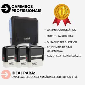 CARACTERÍSTICAS E BENEFÍCIOS: · Qualidade Inigualável: Fabricados com os mais altos padrões de qualidade, os carimbos Trodat oferecem impressões nítidas e consistentes em todas as utilizações. · Durabilidade Superior: Construídos para resistir ao uso frequente, esses carimbos são projetados para proporcionar anos de desempenho confiável. · Facilidade de Uso: Com um design ergonômico e mecanismo de carimbagem suave, os carimbos Trodat garantem uma experiência de carimbar sem esforço. · Versatilidade: Seja no escritório, em casa, empresa ou em sua loja, os carimbos Trodat oferecem versatilidade para uma variedade de aplicações. · Medidas: CNPJ 40X60mm, “PAGO” e “RECEBIDO” 34x10mm. · Tinta: Já vai abastecido com tinta preta. · Rendimento da Tinta: Mais de 3 mil carimbadas, aproximadamente.