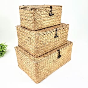Confeccionadas em fibra natural trançada, estas caixas trazem a beleza orgânica e a textura acolhedora que complementam diversos estilos de decoração, do boho ao minimalista. O kit é composto por três tamanhos: a caixa p, com aproximadamente 11,5 cm de altura, 24 cm de largura e 14 cm de profundidade, pesando 210g; a caixa m, com cerca de 13,5 cm de altura, 29,5 cm de largura e 21 cm de profundidade, pesando 360g; e a caixa g, medindo aproximadamente 15 cm de altura, 36,5 cm de largura e 23,5 cm de profundidade, com 430g. Juntas, elas oferecem um espaço prático pra guardar uma variedade de objetos, desde acessórios e produtos de higiene a livros e correspondências, mantendo tudo arrumado e acessível. A diferença de tamanhos permite encaixá-las em diferentes espaços ou utilizá-las em conjunto para uma composição organizada e visualmente agradável.