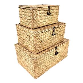 Confeccionadas em fibra natural trançada, estas caixas trazem a beleza orgânica e a textura acolhedora que complementam diversos estilos de decoração, do boho ao minimalista. O kit é composto por três tamanhos: a caixa p, com aproximadamente 11,5 cm de altura, 24 cm de largura e 14 cm de profundidade, pesando 210g; a caixa m, com cerca de 13,5 cm de altura, 29,5 cm de largura e 21 cm de profundidade, pesando 360g; e a caixa g, medindo aproximadamente 15 cm de altura, 36,5 cm de largura e 23,5 cm de profundidade, com 430g. Juntas, elas oferecem um espaço prático pra guardar uma variedade de objetos, desde acessórios e produtos de higiene a livros e correspondências, mantendo tudo arrumado e acessível. A diferença de tamanhos permite encaixá-las em diferentes espaços ou utilizá-las em conjunto para uma composição organizada e visualmente agradável.