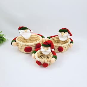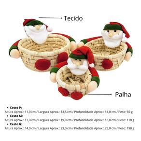 Confeccionados em palha, tecido e plástico, os cestos unem a textura natural e rústica da palha com a alegria do boneco de Papai Noel. Cada cesto é decorado com a figura do Papai Noel, que traz um visual alegre e acolhedor para o seu lar. O design do kit, com peças nos tamanhos P, M e G, permite que você crie composições dinâmicas em sua mesa, utilizando os cestos para diferentes tipos de aperitivos.