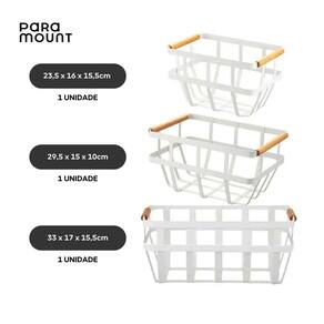 Kit 3 cesto de metal com alca de bambu frutas multiuso ========== sobre o produto ========== Os cestos de metal com alça de bambu multiuso são a solução ideal para quem busca organização e estilo. Com design moderno e funcional, é perfeito para armazenar e organizar itens em diferentes ambientes, como cozinha, banheiro, escritório ou quarto. Suas alças de bambu garantem praticidade no manuseio, enquanto o corpo em metal proporciona durabilidade e resistência. Um item indispensável para otimizar espaços com elegância. ========== especificações ========== Design minimalista que combina metal resistente e alças de bambu natural. Tamanho compacto, ideal para organizar objetos diversos. Versátil: pode ser em cozinhas, banheiros, escritórios e outros ambientes. ========== ficha técnica ========== Medidas: 33 x 17 x 15,5cm 1 unidade Medidas: 29,5 x 15 x 10cm 1 unidade Medidas: 23,5 x 16 x 15,5cm 1 unidade Material: metal / bambu Marca: paramount : 3 meses Estamos online para quaisquer dúvidas, Agradecemos e aguardamos o seu pedido. P: o cesto pode ser utilizado para organizar alimentos R: sim, o cesto é ideal para organizar alimentos embalados ou frutas e vegetais. P: é resistente à umidade R: sim, o cesto possui corpo de metal resistente à umidade, ideal para uso em banheiros ou cozinhas. P: as alças de bambu são firmes R: sim, as alças de bambu são projetadas para suportar o peso do cesto com segurança e praticidade. P: o produto é novo ou
