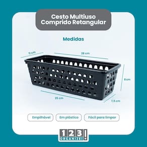 Kit 3 Cesto Multiuso Comprido Retangular e 3 Cesto médio Cesto Multiuso Comprido Retangular Preto 123 Organizei Os Cestos Multiuso 123Organizei, são muito charmosos e discretos. Podem ser em armários, gavetas, guarda roupas e até mesmo em banheiro. MEDIDAS: Altura: 8,00cm Largura: 11,00cm Comprimento: 28,00cm 123organizei ------------------------------------------------------------ CESTO PRETO Médio 123ORGANIZEI Cor PRETO Medidas 20x15,5x6,5Cm Material PLástico Marca 123Organizei Marca: Não Informado