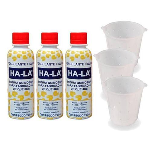 3 Coalhos Ha-la 200ml Coagulante para Queijos + 3 Formas 500g 3 Coalhos Ha-la Líquido 200ml Para Fabricação De Queijo + 3 formas de polietileno para queijo 500g Especialmente desenvolvidos para elaborar queijos com excelente rendimento, com alto padrão de qualidade e eficiência na coagulação de leite, facilitam o processo produtivo garantindo um produto final seguro e com ótimos resultados. Com 7 a 9ml dos coagulantes líquidos HA-LA, é possível coagular até 10 litros de leite, o que significa que 1 frasco de 200ml coagula em média 250 litros de leite. Poder de coagulação de 1 parte de coalho para 3.000 partes de leite. Fabricante: Chr. Hansen Industria e Comércio Ltda Forma plastica fabricada em polietileno de alta densidade pead . Material atoxico, diametro 10cm, altura 11,4cm