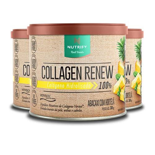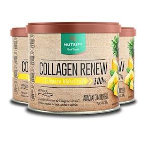 Kit 3 collagen renew colágeno hidrolisado abacaxi nutrify 300g Benefícios: fortalecimento da pele, unhas e cabelos. A firmeza e a sustentação de nossa pele estão diretamente relacionadas à produção de colágeno pelo organismo, que diminui progressivamente ao longo dos anos, ocasionando flacidez e outros sinais de envelhecimento. À base de colágeno hidrolisado, a fórmula de collagen renew nutrify também 2,5 g de peptídeos bioativos de colágeno verisol em cada porção, ajudando a recuperar a firmeza dos tecidos, melhorando sua aparência. Collagen renew nutrify é isento de açúcar, lactose, glúten, corantes e adoçantes artificiais, e conta com adição de vitaminas e minerais antioxidantes, que favorecem a absorção dos peptídeos e promovem o fortalecimento de unhas e cabelos. Nutrify valoriza a origem de cada ingrediente, respeita a integridade de suas fontes naturais e dos envolvidos em sua produção. É assim que criamos produtos saudáveis e saborosos, que fazem bem para as pessoas e para o planeta. Acreditamos que nutrir corpo e mente de modo saudável nos torna capazes de alimentar o mundo com atitudes positivas. Ingredientes: colágeno hidrolisado, colágeno hidrolisado bioativo verisol , mix de vitaminas e minerais vitamina c ácido ascórbico , vitamina e dl alfa-acetato de tocoferol , zinco sulfato de zinco mono-hidratado , vitamina a acetato de retinol , cromo picolinato de cromo , selênio selenito de sódio , vitamina h biotina e vitamina d colecalciferol , acidulante ácido cítrico, aromatizante e edulcorante estévia. Não contém glúten. Contém aromatizante sintético idêntico ao natural. Este produto não é um . Não exceder a recomendação diária de consumo indicada na embalagem. Mantenha fora do alcance de crianças. Este produto é recomendado para adultos a partir de 19 anos. Apresentação: embalagem disponível: lata contendo suplemento em pó. Sabor abacaxi com hortelã. Peso líquido: 300 g produto classificado como: suplemento alimentar de proteína, vitaminas e minerais em pó sabor de abacaxi com hortelã.