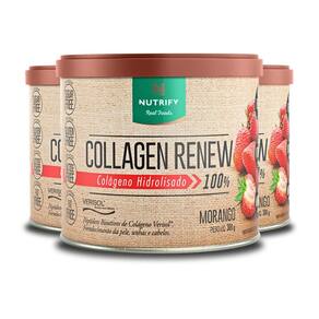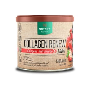 Kit 3 collagen renew colágeno hidrolisado morango nutrify 300g Benefícios: fortalecimento da pele, unhas e cabelos. A firmeza e a sustentação de nossa pele estão diretamente relacionadas à produção de colágeno pelo organismo, que diminui progressivamente ao longo dos anos, ocasionando flacidez e outros sinais de envelhecimento. À base de colágeno hidrolisado, a fórmula de collagen renew nutrify também 2,5 g de peptídeos bioativos de colágeno verisol em cada porção, ajudando a recuperar a firmeza dos tecidos, melhorando sua aparência. Collagen renew nutrify é isento de açúcar, lactose, glúten, corantes e adoçantes artificiais, e conta com adição de vitaminas e minerais antioxidantes, que favorecem a absorção dos peptídeos e promovem o fortalecimento de unhas e cabelos. Nutrify valoriza a origem de cada ingrediente, respeita a integridade de suas fontes naturais e dos envolvidos em sua produção. É assim que criamos produtos saudáveis e saborosos, que fazem bem para as pessoas e para o planeta. Acreditamos que nutrir corpo e mente de modo saudável nos torna capazes de alimentar o mundo com atitudes positivas. Ingredientes: colágeno hidrolisado, colágeno hidrolisado bioativo verisol , mix de vitaminas e minerais vitamina c ácido ascórbico , vitamina e dl alfa-acetato de tocoferol , zinco sulfato de zinco mono-hidratado , vitamina a acetato de retinol , cromo picolinato de cromo , selênio selenito de sódio , vitamina h biotina e vitamina d colecalciferol , acidulante ácido cítrico, aromatizante natural, corante vermelho beterraba e edulcorante estévia. Não contém glúten. Contém aromatizante. Este produto não é um . Não exceder a recomendação diária de consumo indicada na embalagem. Mantenha fora do alcance de crianças. Este produto é recomendado para adultos a partir de 19 anos. Apresentação: embalagem disponível: lata contendo suplemento em pó. Sabor morango. Peso líquido: 300 g produto classificado como: suplemento alimentar de proteína, vitaminas e minerais em pó sabor de morango.