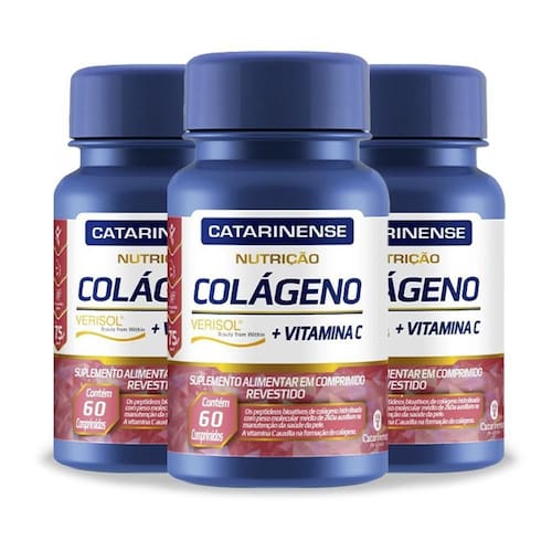 Kit 3 Colágeno Verisol + Vitamina C Catarinense 60 cápsulas RECOMENDAÇÃO DE USO: Recomenda-se ingerir 3 comprimidos ao dia. Este produto é indicado para indivíduos adultos maiores de 19 anos. Este produto não é um . Não exceder a recomendação diária de consumo indicada na embalagem. Mantenha fora do alcance de crianças. Este produto não deve ser consumido por gestantes, lactantes e crianças. Guardar o produto à temperatura ambiente entre 15C e 30C , ao abrigo da luz, bem fechado e protegido da umidade. Se o lacre estiver violado, recuse o produto. Contém dessecante à base de sílica. Ingredientes: peptídeos bioativos de colágeno hidrolisado com peso molecular médio de 2kDa, amido modificado, ascorbato de sódio, agente de massa celulose microcristalina INS 460i , estabilizante croscarmelose sódica INS 468 , glaceantes: álcool polivinílico INS 1203 , talco INS 553iii , hidroxipropilmetilcelulose INS 464 ; corantes: dióxido de titânio INS 171 , óxido de ferro amarelo INS 172iii , laca de alumínio com amarelo de quinoleína. Dispensado de registro conforme Resolução RDC 27/2010. este produto é indicado para indivíduos com 19 anos ou mais. Este produto não é um . Não exceder a recomendação diária de consumo indicada na embalagem. Mantenha fora do alcance de crianças. Este produto não deve ser consumido por gestantes, lactantes e crianças. NÃO CONTÉM GLÚTEN. Marca: Não Informado