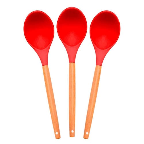 Kit 3 Colher De Silicone Com Cabo de Madeira 32 cm Vermelha Característica do Produto - A Colher de Silicone E Cabo de Madeira é perfeita para auxiliar no preparo dos alimentos, resistente e extremamente prática: possui um orifício para ser pendurada ficando à mostra para facilitar seu dia a dia, pode ser levada ao fogo sem riscar suas panelas e demais utensílios. Produzida em silicone de ótima qualidade suporta temperaturas de até 240C. Super fácil de lavar, não absorve odores indesejáveis e não gruda.
