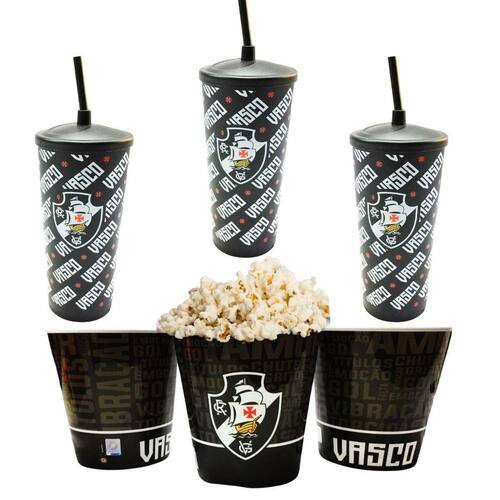 Kit 3 copos + balde de pipoca plástico preto com tampa canudo 500ml infantil criança time vasco
