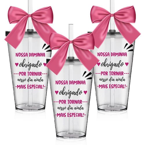 Kit 3 Copos Convite Com Laço Para Daminhas - Agradecimento Os Copos Convite são uma forma linda e deliciosa de convidar ou agradecer os pequenos por participarem de uma data tão única. Com capacidade de 550 ml, você tem a opção de encher os copos com todo tipo de doce e assim encantar as futuras Daminhas. O sim delas será GARANTIDO Especificações: 3 Copos Convite com Tampa e Canudo Transparentes com 3 Laços em Cetim Rosa. Capacidade: 550 ml Material: Acrílico Poliestireno Resistente Laço: Cetim Cor do Copo: Transparente Tampa e Canudo: Transparente Personalização: Transfer Aplicação Direto no Produto Quantidade: 3 Peças Marca: Não Informado