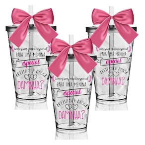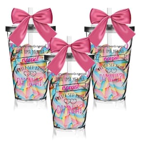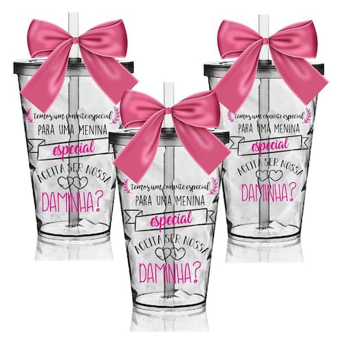 Os Copos Convite são uma forma linda e deliciosa de convidar ou agradecer os pequenos por participarem de uma data tão única Com capacidade de 550 ml, você tem a opção de encher os copos com todo tipo de doce e assim encantar as futuras Daminhas O sim delas será GARANTIDO 3 Copos Convite com Tampa e Canudo Transparentes com 3 Laços em Cetim Rosa. Capacidade: 550 ml Material Copo: Acrílico Poliestireno Resistente Laço: Cetim Cor do Copo: Transparente Tampa e Canudo: Transparente Personalização: Transfer (Aplicação Direto no Produto) Quantidade: 3 Peças