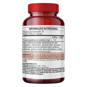 Cranberry em pó Vaccinium macrocarpon . Excipientes: talco e celulose microcristalina. Antiumectantes: estearato de magnésio e dióxido de silício. Composição da cápsula: gelatina, corantes dióxido de titânio, vermelho 40, vermelho 14 e azul brilhante .