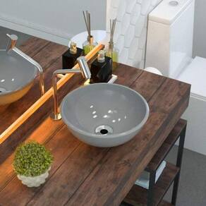A cuba R30W tem seu design redondo e um excelente escoamento de água, é fabricada em mármore sintético com acabamento em Hard Lacca PU, material bem semelhante a louça, muito resistente e mais econômico.... Altura do Conjunto: 12 cm Ambiente: null Ambiente Principal: Banheiro Cor: Cinza Informação Complementar: 3x Cuba de Apoio para Banheiro R30W Redonda Cinza Largura: 30 cm Altura: 12 cm Peso: 2 kg