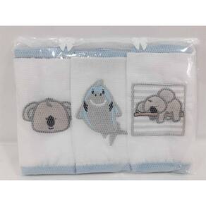 - 3 BABETES EM FRALDA, BORDADAS E COM PRENDEDOR DE CHUPETA, LINHA LUXO, COM ACABAMENTO EM VIÉS. MEDE 40 X 40 CM. 100% ALGODÃO. REF 1545.