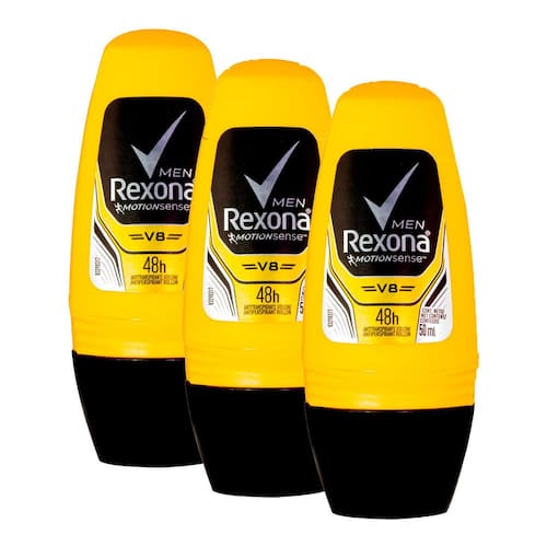 Desodorante Antitranspirante Rexona Men Rollon V8 50ml. Exclusiva Tecnologia MotionSense: proteção para te manter em movimento. 48 horas de proteção contra o odor e a transpiração. Não contém álcool etílico. Testado dermatologicamente. Disponível também na versão Aerosol 150ml. A missão de Rexona é entender cada vez mais sobre a transpiração. O que aprendemos reflete no aperfeiçoamento e inovação dos produtos da marca, buscando oferecer sempre os melhores produtos. Toda a linha de desodorantes antitranspirantes Rexona foi desenvolvida com tecnologia de ponta para que você possa fazer mais e enfrentar os desafios do dia a dia. Não importa se você está escalando uma montanha, correndo para pegar o ônibus, fazendo uma apresentação na empresa ou indo a um encontro, Rexona garante a melhor proteção contra a transpiração. Com o portfólio mais completo da categoria, Rexona oferece o produto ideal para você. Contando com as linhas Feminina, Masculina e Teens, disponíveis nos formatos Aerosol, Rollon e Stick, a marca apresenta diversos benefícios como antimanchas, antibacterial, sem perfume, refrescância, além de uma grande variedade fragrâncias. Os produtos Rexona permitem você fazer mais, sem se preocupar com a transpiração. A cada ano as pessoas se movimentam menos. Sentamos e esperamos, seja no escritório ou no trânsito. Mas, na verdade, sabemos que quanto mais a gente se move, mais a gente vive. Rexona Men V8 combina com os amantes de velocidade e proporciona 48 horas de proteção contra a transpiração e o mau odor, deixando você confiante do primeiro ao último passo. Sua fragrância contém notas verdes e amadeiradas para que você se sinta confiante por mais tempo. Além disso, Rexona Men V8 contém a inovadora tecnologia MotionSense. Suas exclusivas microcápsulas são quebradas pelo atrito dos movimentos, liberando proteção extra ao longo do dia. Proteção para te manter em movimento. Rexona. Não te abandona. Ean: 78923454 Ean: 78923454