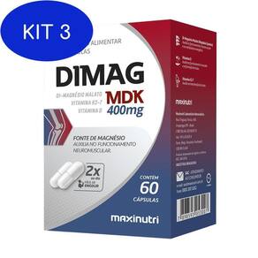 Dimag Mdk Di-Magnésio Malato Vit D3 E K2-7 60 Cáps MaxinutriDimag MDK Di-Magnésio Malato + Vitamina D3 e K2-7 60 Cápsulas Maxinutri O Magnésio: Auxilia na formação de ossos e dentes; Auxilia no metabolismo energético; Auxilia no metabolismo de proteínas, carboidratos e gorduras; Auxilia no equilíbrio dos eletrólitos; Auxilia no funcionamento muscular; Auxilia no funcionamento neuromuscular; Auxilia no processo de divisão celular. A Vitamina D: Auxilia na formação de ossos e dentes; Auxilia na absorção de cálcio e fósforo; Auxilia no funcionamento do sistema imune; Auxilia no funcionamento muscular; Auxilia na manutenção de níveis de cálcio no sangue; Auxilia no processo de divisão celular. A Vitamina K2: Auxilia na coagulação do sangue; Auxilia na manutenção dos ossos. Ingredientes:Di-magnésio malato, vitamina K2 menaquinona7 , vitamina D3 colecalciferol , excipientes: silicato de magnésio e amido, antiumectante: dióxido de silício e cápsula: gelatina. NÃO CONTÉM GLÚTEN Sugestão de uso:Ingerir 2 cápsulas ao dia de preferência com as refeições. Advertência:Produto indicado para o Grupo Populacional igual ou maior que 9 anos. Este produto não é um medicamento. Não exceder a recomendação diária de consumo indicada na embalagem. mantenha fora do alcance de crianças. Conservação:Conservar ao abrigo da luz, calor e umidade. Após aberto consumir em até 60 dias.CONTEÚDO DA EMBALAGEM: 3 Dimag Mdk Di-Magnésio Malato Vit D3 E K2-7 60 Cáps Maxinutri