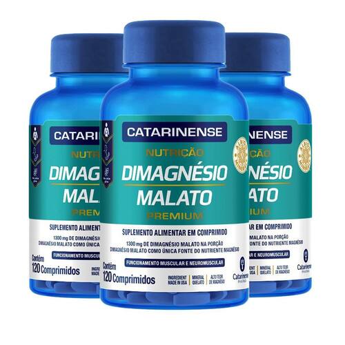 Kit 3 dimagnésio malato catarinense 120 comprimidos Funcionalidades e destaque: funcionamento muscular e neuromuscular, dimagnésio malato como única fonte do nutriente, 260 mg de magnésio elementar por porção. Alto teor de magnésio; dimagnésio malato como única fonte; tecnologia albion; selo albion minerals gold medallion; Ingredientes: dimagnésio malato, agente de massa: celulose microcristalina; estabilizantes: croscarmelose sódica, polivinilpirrolidona e hidroxipropilmetilcelulose; antiumectantes: dióxido de silício e estearato de magnésio. Não contém glúten. Produto dispensado de registro de acordo com a rdc 27/2010. Marca: Não Informado Ean: 7908609538982