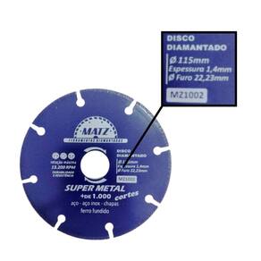 Kit 3 Disco Corte Esmerilhadeira Para Aço 115Mm X 22,23Mm Matz Disco de corte segmentado para aço, aço inox, chapas e ferro fundido, ideal para cortes secos e refrigerados. Desenvolvido para máxima resistência e durabilidade, oferece cortes rápidos e precisos em materiais metálicos, minimizando desgaste e aquecimento. Compatível com esmerilhadeira, possui furo adaptável e acompanha anel de redução para uso em serra mármore Makita . Seus segmentos garantem eficiência e excelente remoção de material, proporcionando um acabamento limpo e . Informações técnicas: Perfil do corte: Segmentado Tipo de corte: A seco e refrigerado Dimensões: - Diâmetro externo: 115mm 4.1/2'' - Diâmetro do furo: 22,23mm 7/8'' - Acompanha anel de redução para 20mm - Espessura: 1,4mm Rotação máxima por minuto: 13.200 - 80m/s Para corte de: Aço, aço inox, chapas e ferro fundido Proporciona qualidade e produtividade na operação Produto de altíssima qualidade com alta performance KIT COM 3 UNIDADES