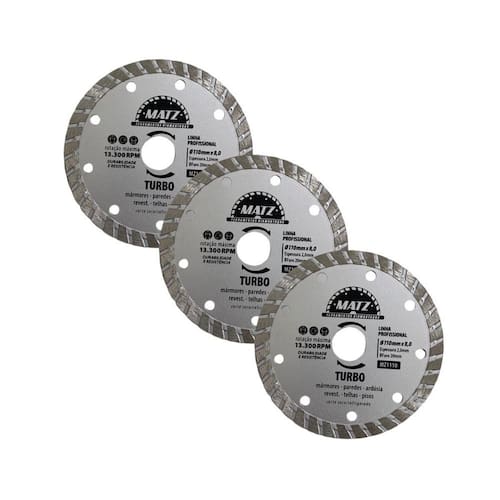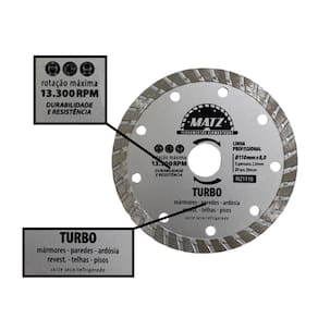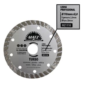 Informações técnicas: Perfil do corte: Turbo Diamantado Tipo de corte: A seco e refrigerado Dimensões: - Diâmetro externo: 110mm 4.3/8'' - Diâmetro do furo: 20mm - Perfil de corte: 8mm - Espessura: 2mm Rotação máxima por minuto RPM : 13.330 - 80m/s Para corte de: Mármores, paredes, ardósia, revestimentos, telhas e pisos Proporciona qualidade e produtividade na operação Produto de altíssima qualidade com alta performance