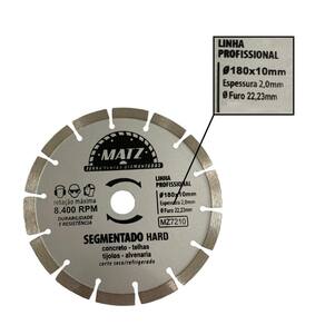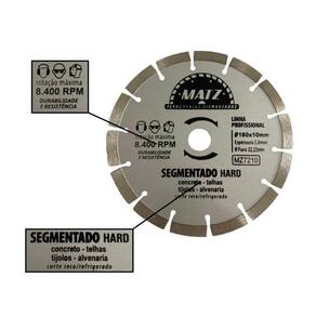 Informações técnicas: Perfil do corte: Segmentado Diamantado Tipo de corte: A seco e refrigerado Dimensões: - Diâmetro externo: 180mm 7.1/4'' - Diâmetro do furo: 22,23mm 7/8'' - Acompanha anel de redução para 20mm - Perfil de corte: 10mm - Espessura: 2mm Rotação máxima por minuto RPM : 8.400 - 80m/s Para corte de: Concreto, telha, tijolo e alvenaria Proporciona qualidade e produtividade na operação Produto de altíssima qualidade com alta performance