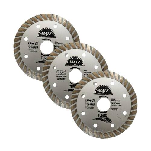 Disco de Corte Diamantado Turbo projetado para cortes rápidos e precisos em mármores, paredes, ardósia, revestimentos, telhas e pisos. Ideal para uso a seco ou refrigerado, oferece alto desempenho e resistência, garantindo cortes limpos e eficientes. Compatível com esmerilhadeira, possui furo adaptável e acompanha anel de redução para uso em serra mármore Makita . Sua borda turbo, proporciona excelente remoção de material, maior velocidade e acabamento . Informações técnicas: Perfil do corte: Turbo Diamantado Tipo de corte: A seco e refrigerado Dimensões: - Diâmetro externo: 110mm 4.3/8'' - Diâmetro do furo: 22,23mm 7/8'' - Acompanha anel de redução para 20mm - Perfil de corte: 10mm - Espessura: 2mm Rotação máxima por minuto RPM : 13.330 - 80m/s Para corte de: Mármores, paredes, ardósia, revestimentos, telhas e pisos Proporciona qualidade e produtividade na operação Produto de altíssima qualidade com alta performance KIT COM 3 UNIDADES Marca: Não Informado