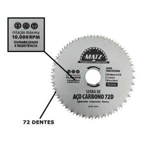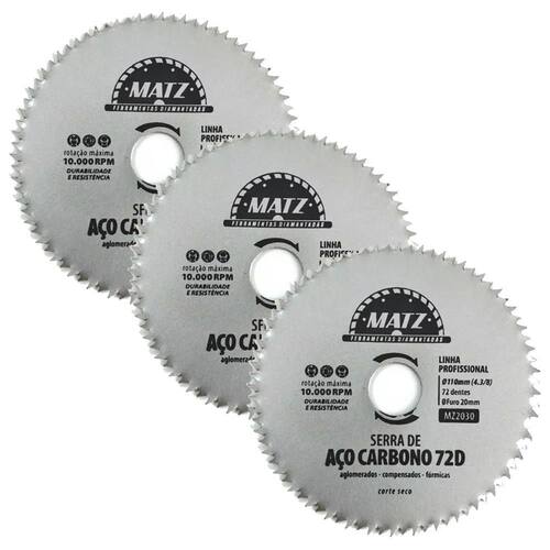 Kit 3 Disco Serra Aço Para Madeira 72 Dentes 110Mm X 20Mm Matz Disco de serra em aço carbono com 72 dentes, ideal para cortes precisos em madeira, aglomerado, compensado e fórmica. Desenvolvido para corte a seco, oferece excelente desempenho e durabilidade, garantindo um acabamento liso e limpo. Seus 72 dentes proporcionam cortes rápidos e minimizam o desgaste, sendo ideal para marcenaria e projetos que exigem alta precisão e qualidade.