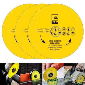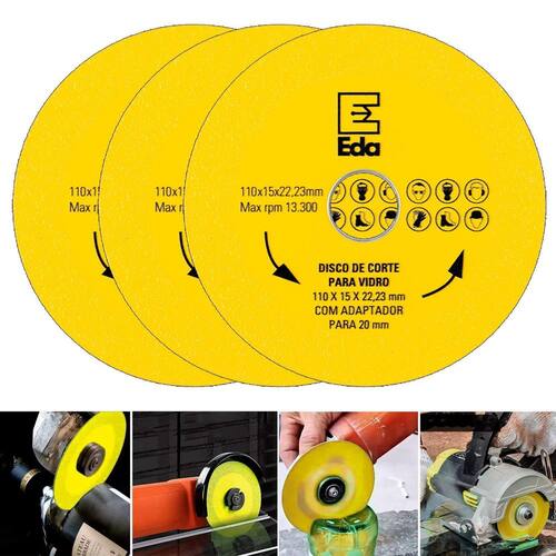 Kit com 3 Discos de Corte 110mm para Vidro Cerâmica Porcelanato Eda Profissional - Marca: Eda Profissional - Kit exclusivo com 3 discos - Diâmetro: 110mm - Espessura da camada diamantada: 15mm - Espessura: 1mm - Furo: 22,23mm - Acompanha adaptador para furo de 20mm - Velocidade máxima: 13.300rpm - para corte suave, chanfradura e polimento de vidro, espelho, jade, cristal, garrafas de vidro, cerâmica, azulejos cerâmicos e outros materiais - Não corta vidro temperado - Materiais de alta qualidade, feito de partículas abrasivas de diamante muito finas e uniformes - Lâmina com excelente desempenho de corte e baixo ruído de moagem - Menos poeira, menos detritos, mais conveniente, vida útil mais segura e mais longa. - Corte rápido e preciso. - A lâmina de corte de diamante é resistente a alta temperatura, o que pode reduzir a vibração e cortar mais reto e mais rápido - Peso bruto: 100 gramas - : 90 dias Marca: Não Informado