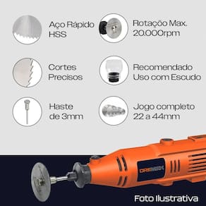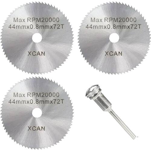 Kit com 3 Discos Lâmina de Serra 44mm com Suporte 3mm para Micro Retíficas Multimarcas Dremax - Marca: Dremax - Kogo exclusivo com 3 discos e suporte - Material: Aço Rápido HSS - Diâmetro: 44mm - Espessura: 0,8mm - Número de dentes: 72 - Acompanha suporte com haste de 3mm - Ideal para o corte de materiais duros como madeira, plásticos, laminados, alumínio, etc - Indicado para uso com furadeiras e micro retíficas de qualquer marca Dremel, Charbs, etc - Adequado para uso em Carpintaria e artesanato - Para sua segurança, aperte bem o parafuso da haste - Velocidade máxima de operação: 20.000 rpm - Garantia: 90 dias A DREMAX é a primeira e única marca brasileira dedicada exclusivamente às micro retíficas, acessórios e acoplamentos para esta indispensável ferramenta. Seja para trabalhos de precisão, artesanato, modelagem ou reparos, a DREMAX tem o produto certo para você. Marca: Dremax