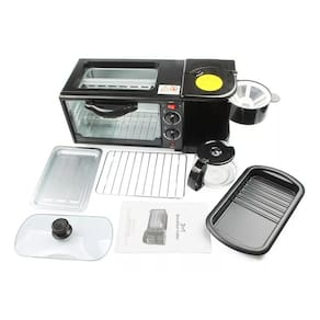 Mini forno elétrico 3 em 1 com cafeteira, frigideira e forno. Design compacto e eficiente, ideal para pequenos espaços. Cafeteira integrada para café fresco a qualquer momento. Frigideira removível para cozinhar uma variedade de alimentos. Forno para fatias de pão crocantes e douradas. Fácil de usar e limpar.Forno autolimpante
