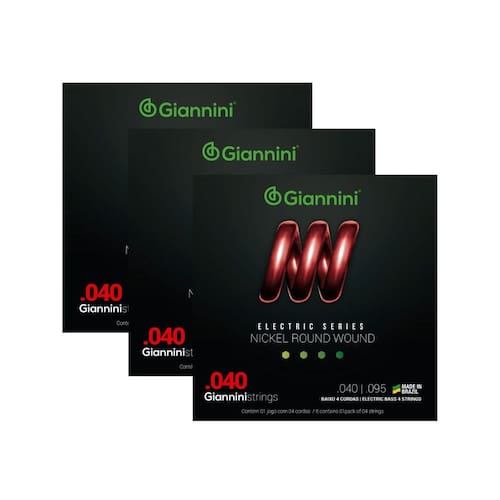 Kit 3 Encordoamento Baixo Giannini Electric GEEBRL Nickel 4C .040"A série Electric traz toda a sonoridade dos encordoamentos Giannini para a sua guitarra e contra-baixo. O encordoamento para baixo 04 cordas Giannini GEEBRL é composto de um núcleo de aço revestido por Níquel. O Níquel produz um som brilhante e agressivo que atende uma grande variedades de estilos musicais, sendo bem resistente a oxidação e corrosão.