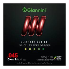 Kit 3 Encordoamento Baixo Giannini Electric GEEBRS5 Nickel 0.045”A série Electric traz toda a sonoridade dos encordoamentos Giannini para a sua guitarra e contra-baixo. O encordoamento para baixo 05 cordas Giannini GEEBRS5 é composto de um núcleo de aço revestido por Níquel. O Níquel produz um som brilhante e agressivo que atende uma grande variedades de estilos musicais, sendo bem resistente a oxidação e corrosão. Especificações Fabricação: BrasilAlma: AçoRevestimento: NíquelAcabamento: BolinhaComprimento de escala: 864 mm / 34? Inch: 0.045; 0.065; 0.080; 0.100; 0.130 *Imagens Ilustrativas**Garantia: 3 Meses*