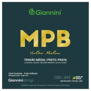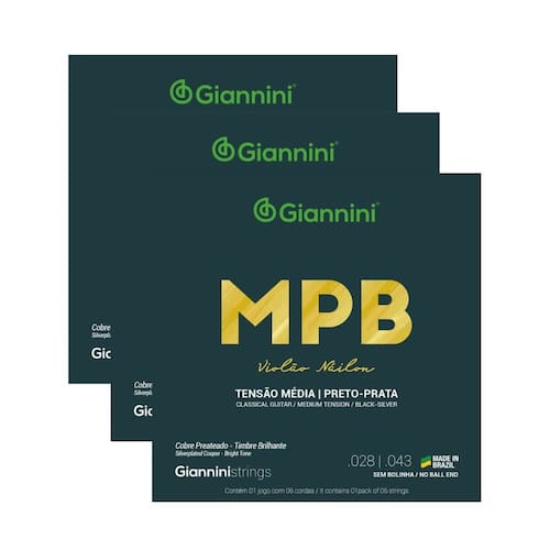 Kit 3 Encordoamentos Violão Giannini MPB GENWBS Média Nylon Preto-PrataA série MPB apresenta toda a sonoridade que a nossa música brasileira pede.O encordoamento para violão náilon Giannini MPB GENWBS é indicado para músicos que gostam de cordas com uma pegada média. Produzidas em náilon preto-prata, o modelo GENWBS tem tensão média. Especificações:Fabricação: BrasilSem bolinhaAlma: NáilonRevestimento: Cobre PrateadoAcabamento: Color codeCordas primas em náilon pretoComprimento de escala: 648 mm / 25 1/2?