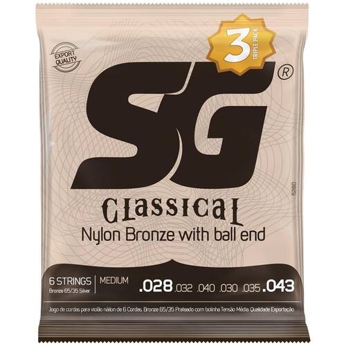 Pacote que contém três jogos de cordas SG Nylon Bronze com tensão Medium que trazem um som suave, quente, encorpado e brilhante. Muito utilizadas em estilos musicais que tradicionalmente tem o violão como a MPB, a Bossa Nova, o Samba e baladas Pop.