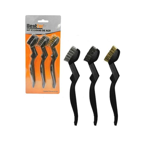 Kit c/3 Escovas de Aço Bestfer O Kit Escovas de Aço Bestfer é ideal para o uso geral em trabalhos de limpeza e acabamento. Remoção de ferrugem, fuligem, tinta e argamassa. A escova de Aço Bestfer Bronze, limpa objetos de metal sem gerar faíscas. Medida: Comprimento 17 cm Ean: 7899206173075