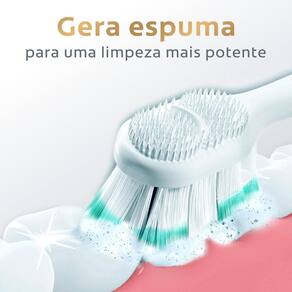 Como funciona? Essa configuração única de cerdas gera espuma rapidamente, levando a pasta de dente a lugares onde as bactérias mais se escondem, como os espaços estreitos entre os dentes e sobre a linha da gengiva. Além disso, seu limpador de língua e bochechas remove as bactérias causadoras do mau hálito.