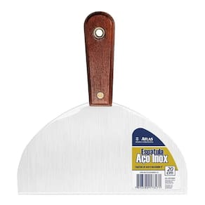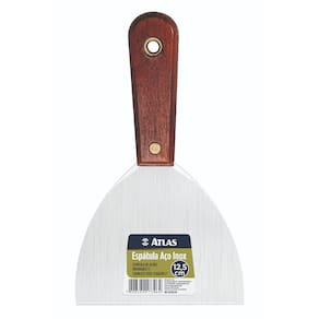 Espátula com lâmina de aço inox e cabo de madeira tratada. Resistente, proporciona um ótimo acabamento, precisão e conforto. Disponível de diversos tamanhos. Espátula ideal para raspagem e aplicação de gesso, massa corrida e massas de textura.