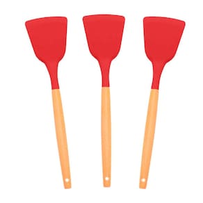 Kit 3 Espátulas Silicone Chapa 32cm Cabo Madeira Vermelha Característica do Produto - Feita em Silicone e Madeira a espátula serve para facilitar o seu dia a dia na cozinha proporcionando maior praticidade no momento de preparar e servir os seus convidados. Resistente e elegante. Não risca a panela sendo muito fácil de limpar. Sendo um produto fundamental para preparar suas receitas. Suporta Temperatura Mínima 40C e máxima - 230C