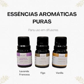 Kit 3 essências aromáticas puras 10ml cada aromá: 1 essência aromática pura lavanda francesa aromá 10ml tranquilidade 1 essência aromática pura figo aromá 10ml alegria 1 essência aromática pura vanilla aromá 10ml luxo 1 saquinho 100% algodão Essência aromática pura lavanda francesa aromá 10ml tranquilidade Essência pura aromática para uso em difusores elétricos ou cerâmicos. A fragrância lavanda francesa exclusiva da aromá transmite tranquilidade ao ambiente. Indicada principalmente para sala de estar e quartos, também pode ser Utilizado em ambiente de trabalho. Descrição olfativa lavanda francesa: Lavanda é originária da europa, age sobre o mesencéfalo estimulando-o através do nervo olfativo o que confere ação . Traz sensação de relaxamento e tranquilidade. Topo: lavanda e notas cítricas Corpo: rosa, alecrim, muguet e a suavidade do lavandin Fundo: âmbar e madeiras Embalagem plástica âmbar com gotejador 10ml Essência aromática pura figo aromá 10ml alegria Essência pura aromática para uso em difusores elétricos ou cerâmicos. A fragrância figo exclusiva da aromá transmite alegria. Indicada principalmente para sala de estar e quartos, também pode ser Utilizado em ambiente de trabalho. Descrição olfativa figo: Figo é uma fruta delicada, doce e muito aromática. Sua fragrância é contagiante e transfere alegria ao ambiente Topo: notas lactônicas, madresilva, coco e a delicada peônia. Corpo: notas quentes de chocolate, baunilha, figo e o aconchego do powdery Fundo: elegância do âmbar, vetiver e cedro Embalagem plástica âmbar com gotejador 10ml Essência aromática pura vanilla aromá 10ml luxo Essência pura aromática para uso em difusores elétricos ou cerâmicos. A fragrância vanilla exclusiva da aromá transmite luxo indicada principalmente para sala de estar e quartos, também pode ser Utilizado em ambiente de trabalho. Descrição olfativa vanilla: Notas de topo: limão, alecrim e bergamota Notas de corpo: baunilha e cedro Notas de fundo: patchouli e musk Embalagem plástica âmbar com gotejador 10ml Modo de uso: Uso em difusores / umidificadores elétricos: cerca de 10 gotas após preencher com água o difusor. Uso em difusores elétricos cerâmicos: complete até cerca da metade do difusor com a essência, ligue na tomada e ligue o botão. Marca: Não Informado Ean: 7898747751421