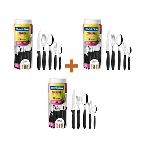 Componentes do kit: - 3 faqueiros inox de 30 peças ipanema preto - tramontina Faqueiro facas talheres ipanema 30pç tramontina 23398/088 Faca e garfo. Descrição ficha técnica: Modelo ipanema 30 peças. Cód. 23398/088 cor preta. Uso seguro e adequado: - antes da primeira utilização, lave bem as peças e seque-as. - produtos cortantes e perfurantes, tenha cuidado e mantenha sempre fora de alcance das crianças. - para maior durabilidade dos produtos, recomenda-se secar bem antes de guardar, mesmo após lavagem em máquinas. - para descarte dos produtos e embalagem, siga a orientação de reciclagem vigente. Conteúdo de cada conjunto: 6 facas lâmina 11,2cm - medida 21cm 6 garfos de mesa. - medida 19cm 6 colheres de mesa. - medida 19cm 6 garfos para sobremesa. - medida 14cm 6 colheres para chá. - medida 14cm - lâmina em aço inox, maior resistência a desgaste por fricção, raspagem. - fácil manuseio e limpeza sempre cuidando com navalha e pontas . - 30 pç por embalagem. Peso líquido: 0,95 kg Peso bruto: 1,05 kg Especificação da embalagem do kit: Peso bruto: 3,15 kg Medida embalagem: 27 cm alt x 31 cm l x 9 cm p. Perguntas frequentes: - Sim, , lacrado e de fábrica. - tem - qual a é de 12 meses contra defeito de fabricação.